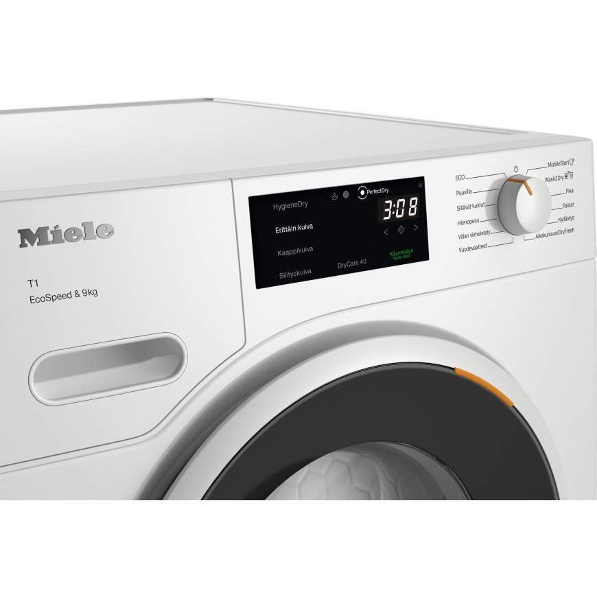 Pay 5x239.80€Miele T1 EcoSpeed 9 kg tumble dryer dries even large loads of laundry gently and quickly. The device combines energy efficiency, smart functions, and practical design. Thanks to the A+++ energy class and EcoDry technology, drying is economical