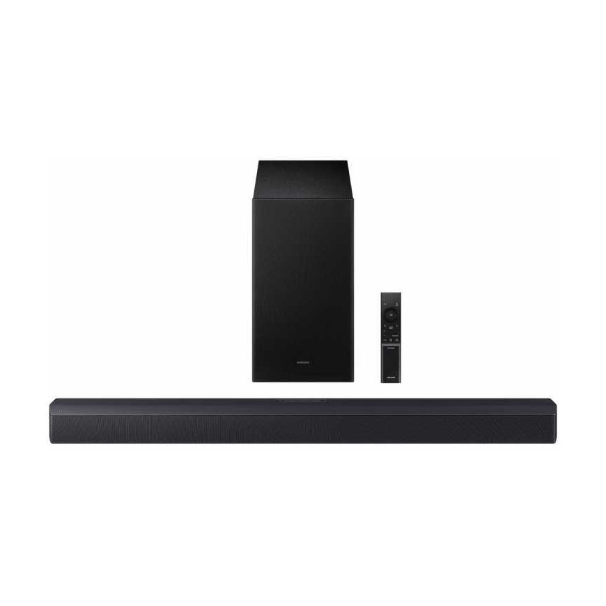 Pay 5x29.40€"Samsung HW-B450F" – this is a powerful 2.1 channel speaker system with a wireless subwoofer, designed for an immersive home theater experience. "Dolby Audio" and "DTS Virtual:X" create 3D surround sound, which, using audio processing technologies, provides a sense of height – no upward-facing speakers are needed. Key features: • Number of channels: 2.1 • Number of speakers: 3 • Color: Titanium black • Connectivity: "Bluetooth " • HDMI CEC • HDMI ARC • Optical input