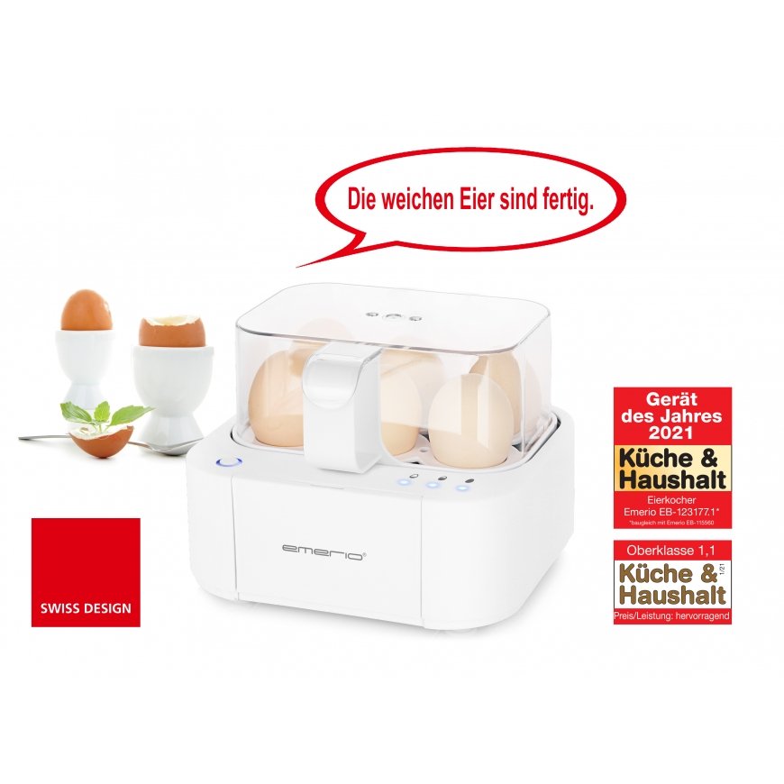 The Emerio talking egg cooker makes boiling eggs effortless and precise. With it, you can cook your eggs exactly the way you want – soft, medium, or hard – without guessing or constantly watching the time. The egg cooker clearly indicates
