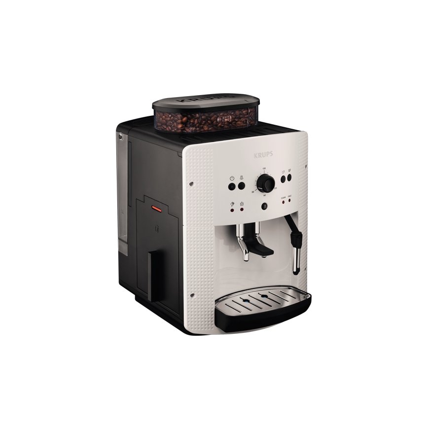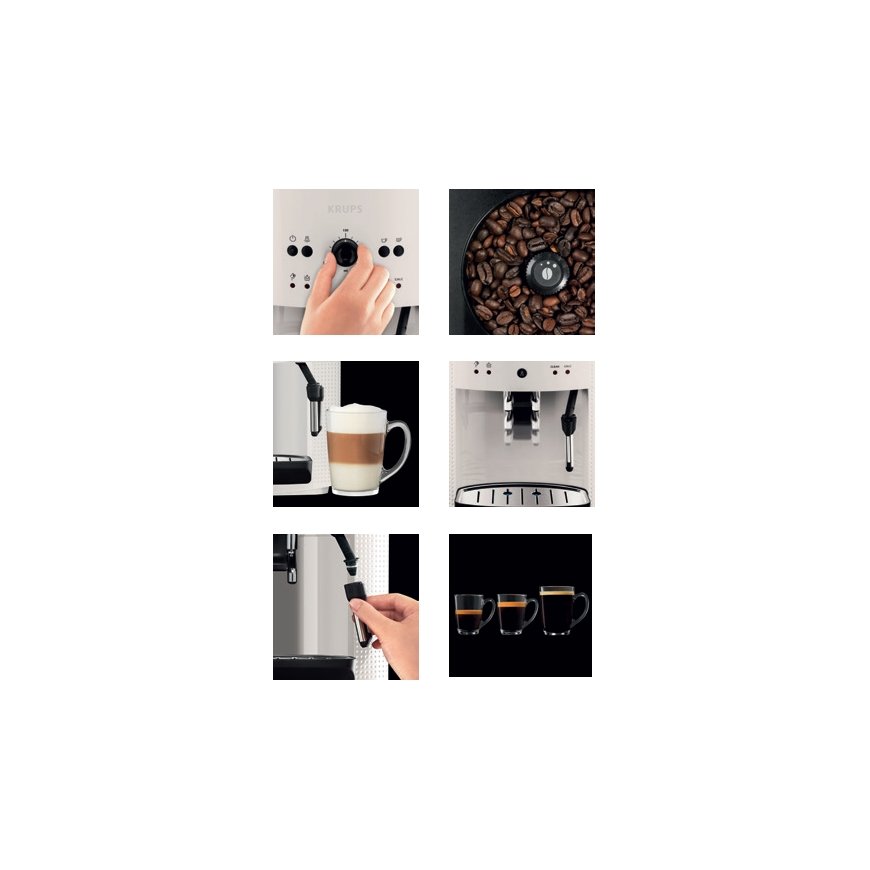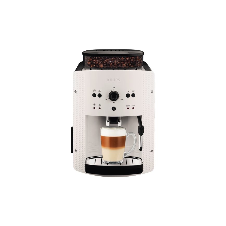 Pay 5x72.17€Krups EA8105. Product type: Espresso machine, Coffee maker type: Fully-auto, Water tank capacity: 1.6 L, Coffee input type: Coffee beans, Capacity in cups: 9 cups, Built-in grinder. Power: 1450 W. Product colour: White