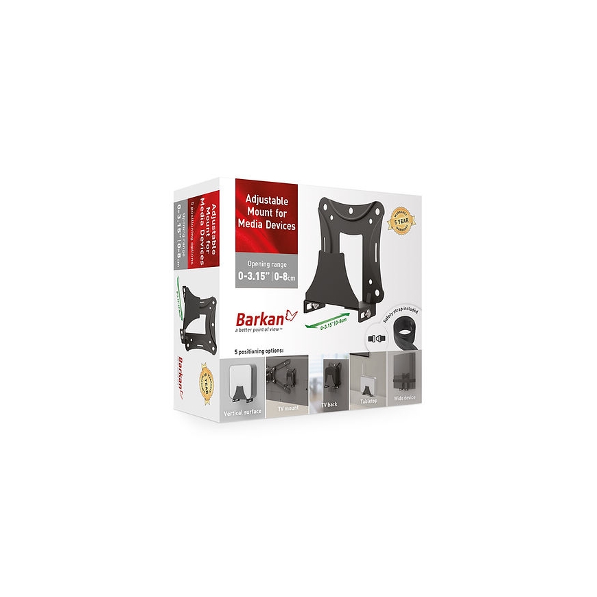 - Assembled easily and creates a clean look for the TV area. - Multiple positioning options: - TV mount connection - with 2 included adaptors (for 200mm back screen holes). - TV Back holes connection - 1 or 2 connection points. - Wall connection with screws. - Tabletop positioning. - Wide media device mounting with the included safety strap. - Max device weight when connected to the wall - 13.2lbs/ 6kg. - Max device weight when connected to the back of the screen or standing - 7.7lbs/ 3.5kg - Telescopic adjustment allows opening range of 0-2.35"/ 0-6 cm, and up to 3.15"/ 8cm when using the safety strap. - 4 x 3/8" / 9.5 mm protective pads are included. - Color: black. - Product installation - please make sure to follow the assembly instructions precisely. If you have any questions contact our support team. - Previous and parallel versions: BM80.