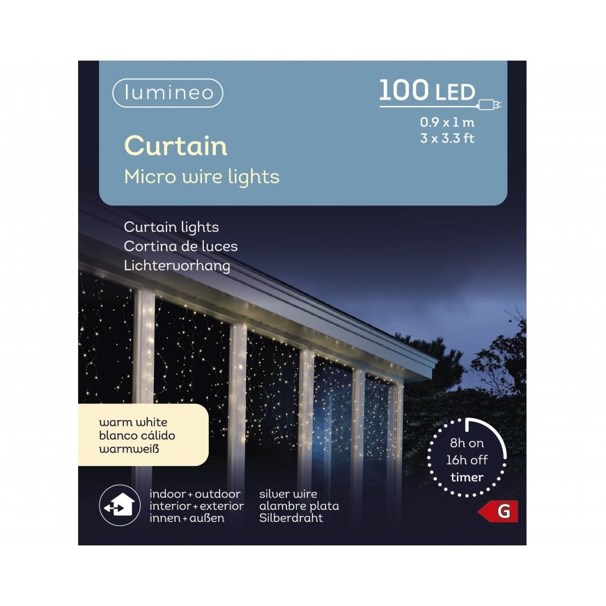 Lumineo Micro LED Curtain Steady light string brings a light and elegant illumination to outdoor spaces. The set includes 100 small warm white micro LED lights that spread over 9