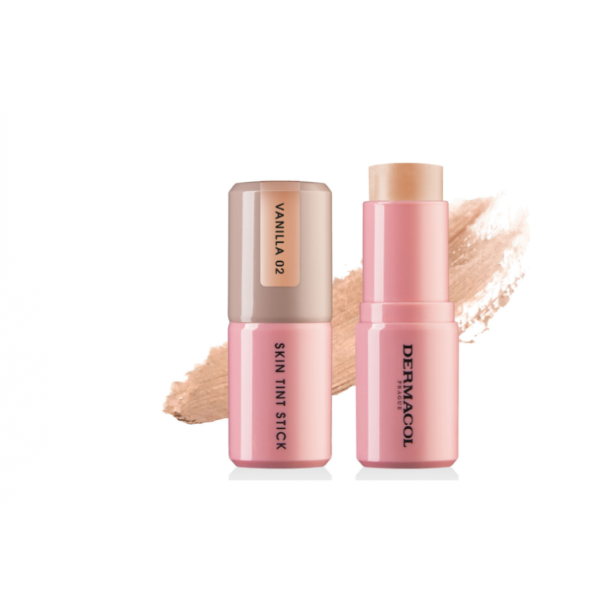 Dermacol Skin Tint Stick 02 Vanilla — a foundation stick with a lightweight creamy texture that evens out skin tone and conceals minor imperfections, providing a natural, fresh finish. The Vanilla shade offers a soft light tone and blends easily. Perfect for everyday makeup and a natural look.