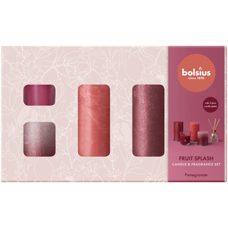 Bolsius Gift Set Fruit Splash pomegranate — a home fragrance gift set with a fresh pomegranate scent and fruity accents. This set includes a fragrance diffuser with reeds, a small scented candle in a glass container and a decorative cylindrical candle, designed to fill living spaces with a cozy, refreshing and pleasant atmosphere. Ideal as a gift or seasonal decorative element.