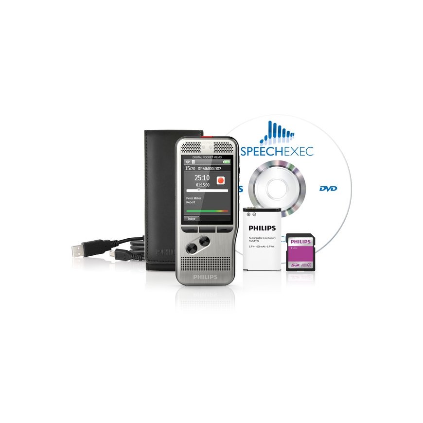 USB cable, Quick start guide, Pocket Memo digital voice recorder, Memory card, Rechargeable battery, Pouch, SpeechExec Dictate workflow software
