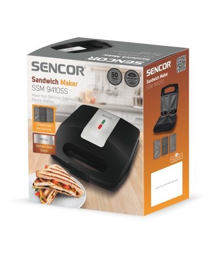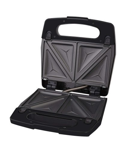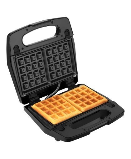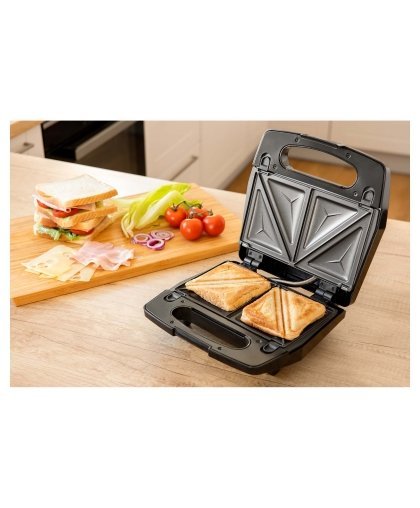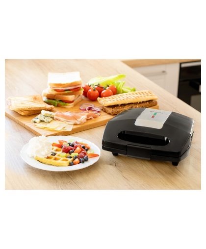 Prepare sandwiches, grill meat or bake waffles. 3 exchangeable baking plates 126 x 230 mm (triangle-shape sandwich, panini, waffle). CoolTouch housing. Easy to clean baking surfaces. Non-stick surface treatment of baking surfaces. Heat insulated handle and body. Power indicator - red indicator light. Ready to bake indicator - green indicator light. Option to store in a vertical position. Safety thermal fuse. Length of the power cord 85 cm. Rated power 700 W. Automatic temperature control