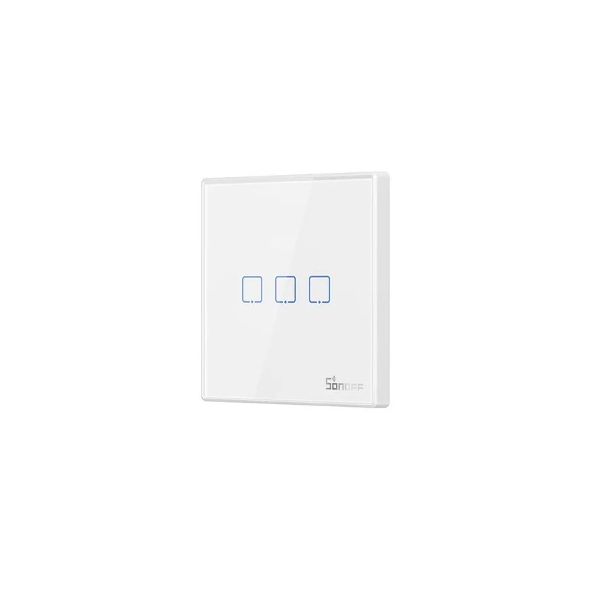 Sonoff T2EU3C-RF. Toote värv: Valge, Korpuse materjal: Plast, Kinnituse tüüp: Seinale paigaldamine. Sagedusriba: 0.433 GHz. Laius: 86 mm, Sügavus: 9 mm, Kõrgus: 86 mm
