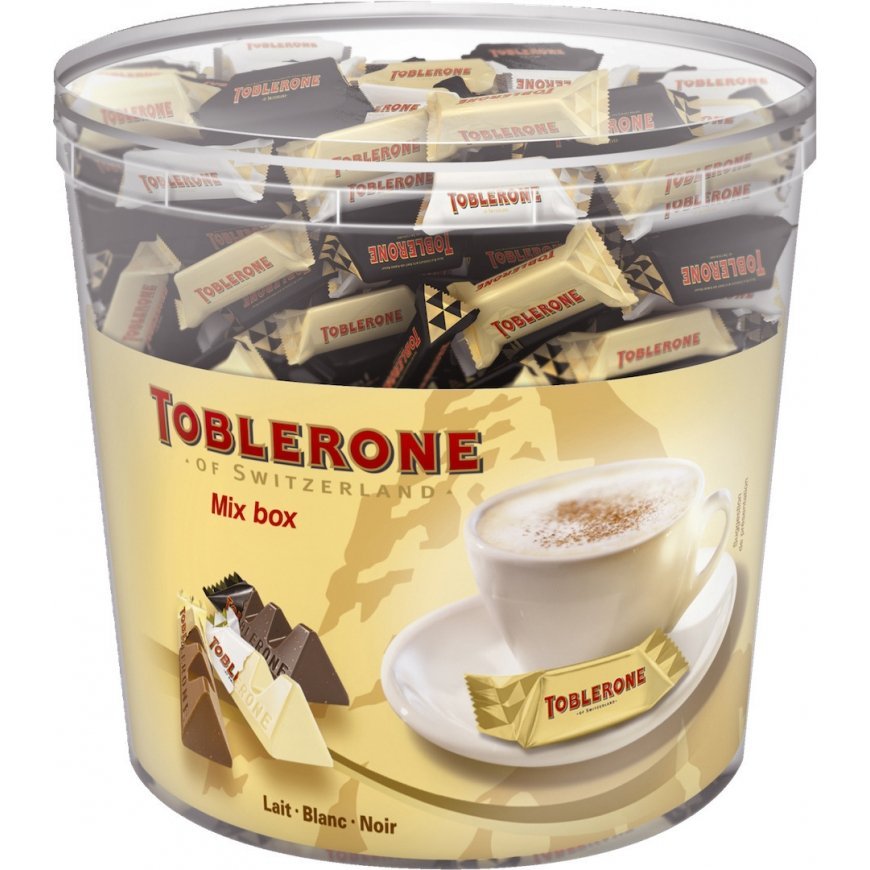 Mini-sized individually packed Toblerone Tiny bars in a convenient and good-sized bucket. The package contains three different flavors: milk chocolate, white chocolate and dark chocolate. The classic Toblerone chocolate is a combination of velvety milk chocolate, honey and nougat. The classic triangular shape of the Swiss Toblerone has been captivating since 1908.