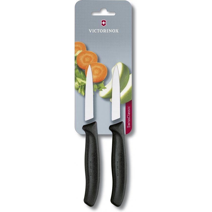 The Victorinox Swiss Classic paring knife is an absolute choice for work that requires precision. This set includes two straight-edged, sharp-tipped peelers, with which you can remove seeds from peppers and chunks from apples or potatoes in the blink of an eye. The ergonomically shaped handle is comfortable in the hand.