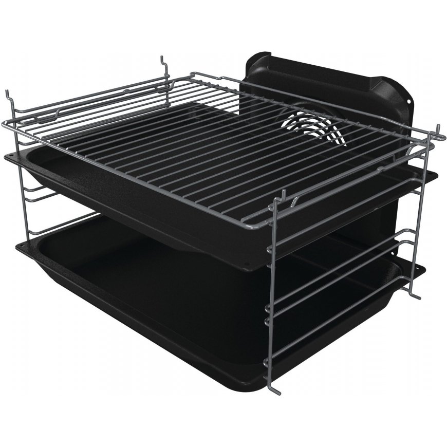The standard equipment of the oven comes with two shallow and one really deep baking pan and an oven rack. The trays and oven pan are made of acid-resistant enamel, which is very durable and easy to clean.