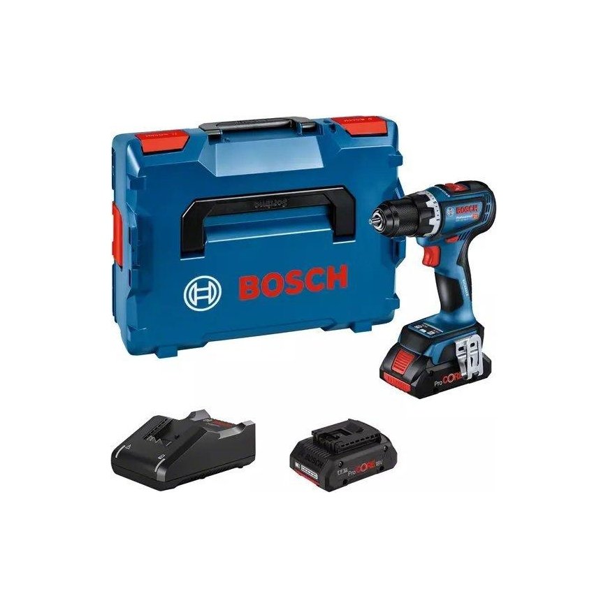 Bosch GSR 18V-90 CC The GSR 18V-90 "Professional" is an efficient battery with a non-hexagonal motor that ensures maximum efficiency thanks to a torque of 64 Nm and a rotation frequency of 2,100 min-1. The 163 mm long compact body ensures comfortable work. The 13 mm continuous metal drill holder ensures that the torque is properly transferred during every job. The auger provides a very high level of control of the tool, which helps to better protect the health of the users, but also protects the tool itself: the HMI enables the KickBack Control function, which helps to reduce the risk of a sudden reaction of the tool when the auxiliary devices become blocked in the material. In addition, the precision clutch turns off the tool after a set torque interval has been reached, reducing wear and noise of the clutch. An efficient battery drill with a compact body size and excellent control of the tool. diameter for drilling holes. The C GSR 18V-90 Professional model must be compatible with all Bosch Professional 18V (18V Professional System) batteries and chargers. What's more? A cordless drill for precision drilling. A 20-step torque adjustment range and a brushed carbon motor with 64Nm of torque should provide adequate power for a variety of work tasks. It includes ProCore 2 x 4.0 Ah batteries, charger and L-Boxx. battery voltage 18 V idle speed 2100 min ⁻ --maximum bore diameter 68 mm weight 1.1 kg
