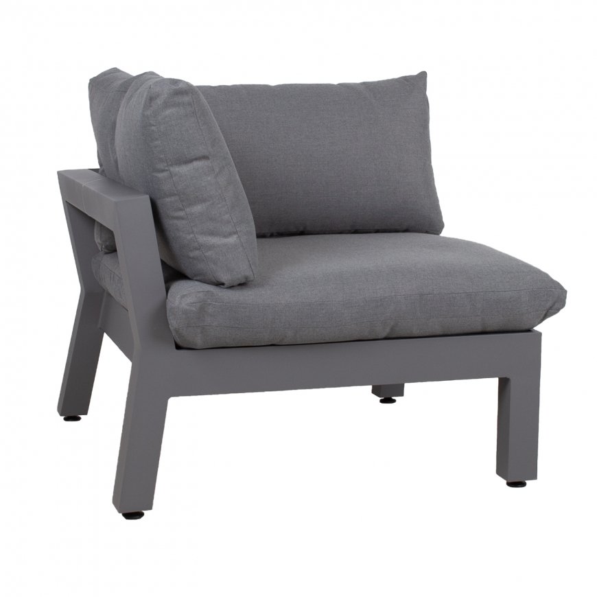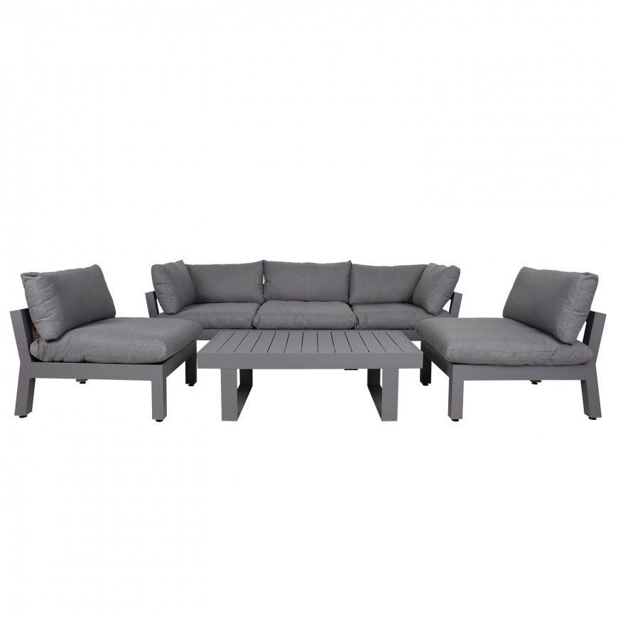 Aiamööblikomplekt FLUFFY mooduldiivan ja laud. Komplekti kuulub 2 nurgamoodulit, 3 vahemoodulit ja diivanilaud. Moodulite paigutust ja järjekorda on lihtne muuta. Diivani moodulite raamid ja laud on valmistatud alumiiniumist ja viimistletud halli pulbervärviga. Laua mõõdud on 133x73,5xH42cm. Nugamooduli mõõdud on 93x93xH66cm, vahemooduli mõõdud on 82x93xH66cm. Istmemoodulite põhjas on laiad põimitud rihmad, mida katab 3cm poroloonmatt. Paksud ja pehmed padjad ning elastne istmepõhi tagavad suurepärase istumismugavuse. Istme kõrgus raami ääreni on 35cm, koos padjaga 51cm. Istmepatjade mõõdud on 87x87xH16cm, seljatoepatjade mõõdud on 87x43x18cm, 72x43x16cm. Padjakatted on valmistatud hallist polüesterkangast. Padjakatted on eemaldatavad ja pestavad. Toode on muutlikes ilmastikutingimustes hästi vastupidav ja lihtsalt hooldatav. Kaitset ilmastikuolude eest vajavad ainult padjad. Hea lahendus patjade igapäevaseks hoiustamiseks ja kuivana hoidmiseks on padjakast. Välitingimustes kasutatava mööbli eluea pikendamiseks soovitame kasutada välimööbli katteid. HOIUSTAMINE: suvehooaja lõppedes soovitame aiamööblit hoiustada siseruumides. Puhastage ja kuivatage mööbel enne hoiule panekut. Kasutage hoiustamiseks kuiva ning hea ventilatsiooniga ruumi.