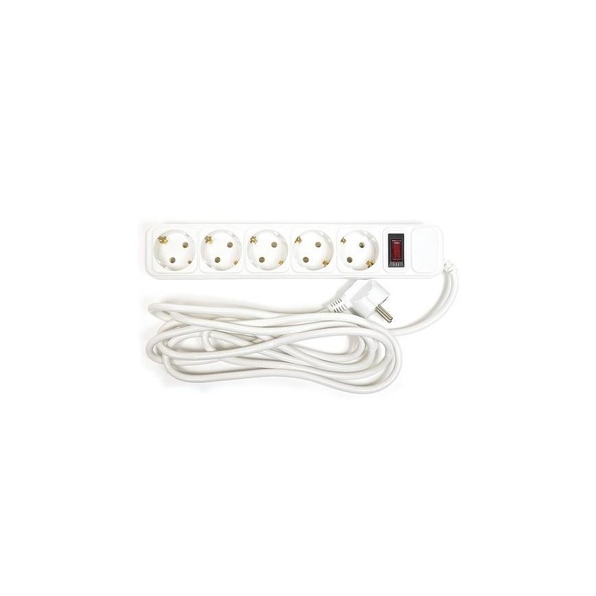 Technical data: Number of slots: 5 pcs. Cable length: 3 m. Maximum load: 2400W (10A). Conductor cross-sectional area: 3 x 1.5 mm². Conductor material: copper. Body material: polypropylene. Input sockets: European standard. Power cable: EU plug. Switch: Yes. Color: white. Dimensions: 50x280x40mm. Use: internal.