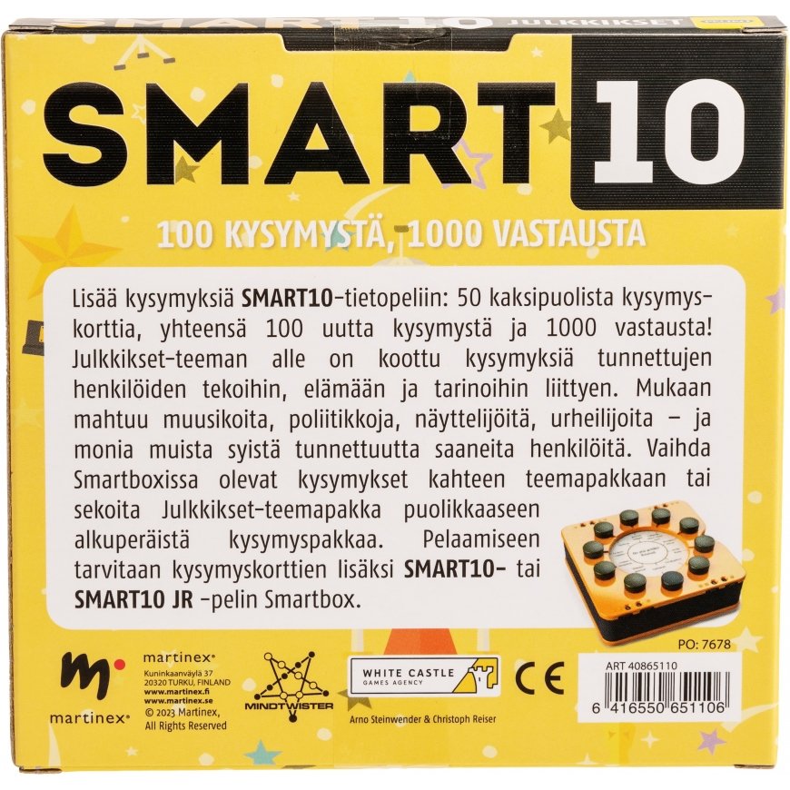 Add questions to the SMART10 trivia game. The package contains 50 double-sided question cards, a total of 100 new questions and 1000 new answers. Change the question cards in the Smartbox to two theme decks or mix the theme deck with half of the original question deck. In addition to the question cards, you need the SMART10 or SMART10 JR game Smartbox to play.