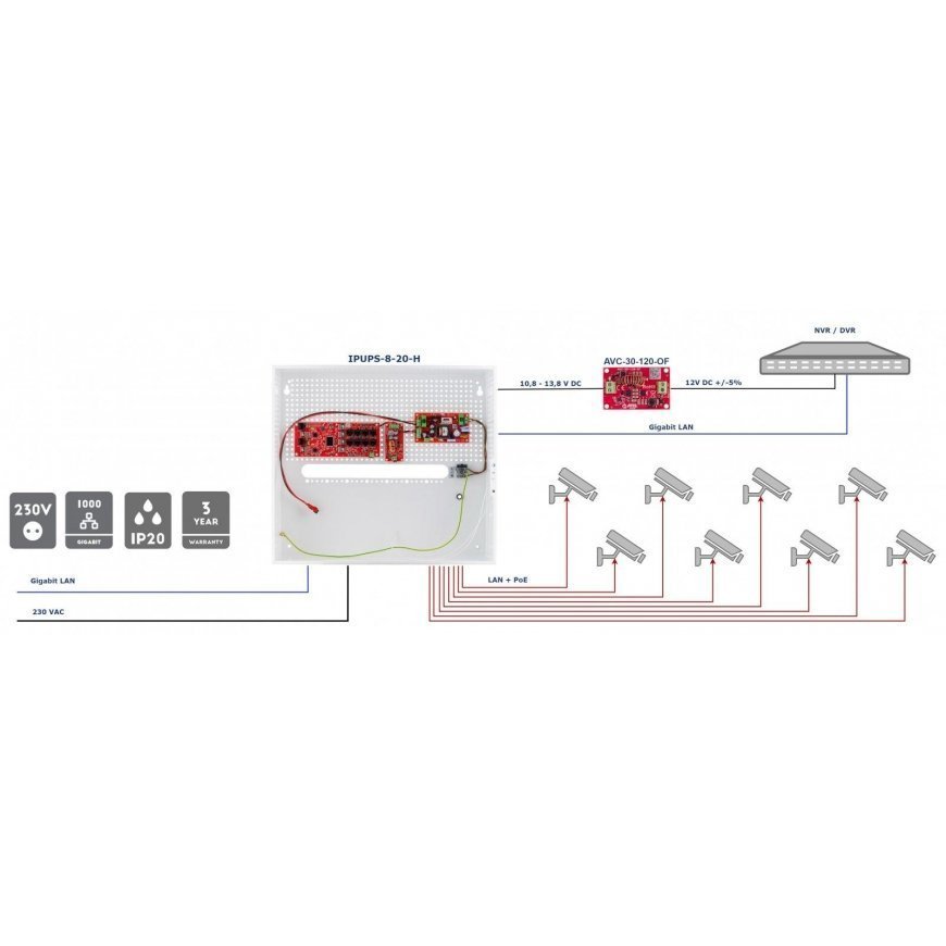 The IPUPS-8-20-H set consists of XPOE-10-20A-OF switch module, AUPS‑70‑120‑OF buffered power supply module and ASUC-100-480-OF voltage converter module enclosed in the ABOX-H internal enclosure with space for 2 18Ah batteries.