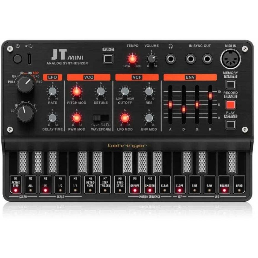 Maksa 5x23.80€„Behringer JT MINI“ – kaasaskantav analoogne polüfooniline sünteesija koos 3 VCO, mitme režiimiga VCF filtriga, arpeggiatore ja 16-sammulise sekvenceriga. Peamised omadused: programmeeritav polüfooniline analoogne sünteesija; disain on inspireeritud klassikalisest „Jupiter“ mudelist 80ndatest; 27 puutetundlikku klahvi; täielikult analoogne helitee, mis põhineb autentsetel VCO, VCF ja VCA lahendustel; VCO osillaator 4 vahetatava lainekuju režiimiga: „Saw“ / „Triangle“ / „Square“ / „Pulse“; impulsi laiuse modifikatsioon pakub täiendavat helipaletti; klassikaline filter mitme režiimi ja resonantsi juhtimisega; 16-sammuline sekvencer 8 mälupesaga ja võimalusega salvestada nuppude liikumisi; LFO filter „Saw“ / „Triangle“ / „Square“ / juhuslike lainekuju režiimidega vibrato, tremolo ja vokali filtri (wah) efektide jaoks; VCA spetsiaalselt loodud ADSR filtriga; USB C tüüpi ühendus toiteks arvutist, nutitelefonist või välist akust; sünkroniseerimise sisendi ja väljundi ühendused sünkroniseerimiseks teiste instrumentidega; täielik MIDI rakendamine (sealhulgas CC juhtimine, kõik võimalikud parameetrid ja LOAD/SAVE funktsioonid).