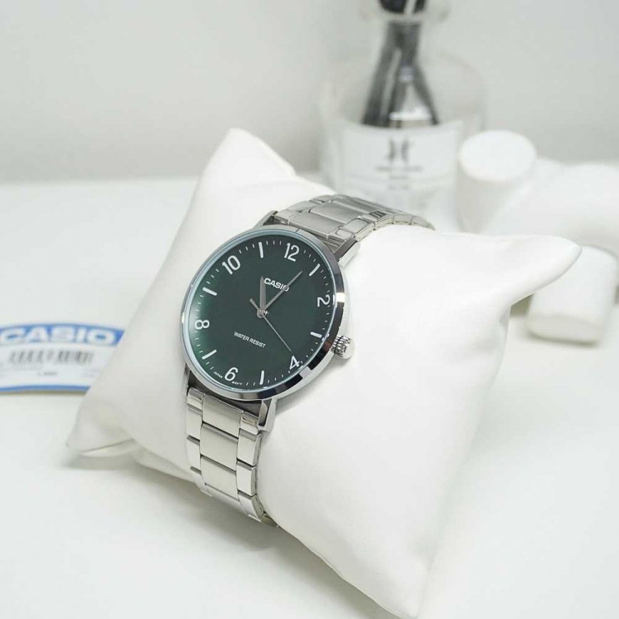 CASIO MTP-VT03D-3B meeste kell ühendab klassikalise elegantsi modernse funktsionaalsusega, mistõttu iga mees tunneb end erilisena. See mudel on tõeline minimalistliku disaini austusavaldus – ümmargune, roheline kellanäidik peene hõbedaste noolte ja indeksitega kiirgab rahu ja rafineeritust. Peen hõbedane korpus lisab luksust, mistõttu sobib see ideaalselt nii ülikonna kui ka vabaaja riietusega. See on kell, mis mitte ainult ei näita aega, vaid räägib ka teie heast maitsest.