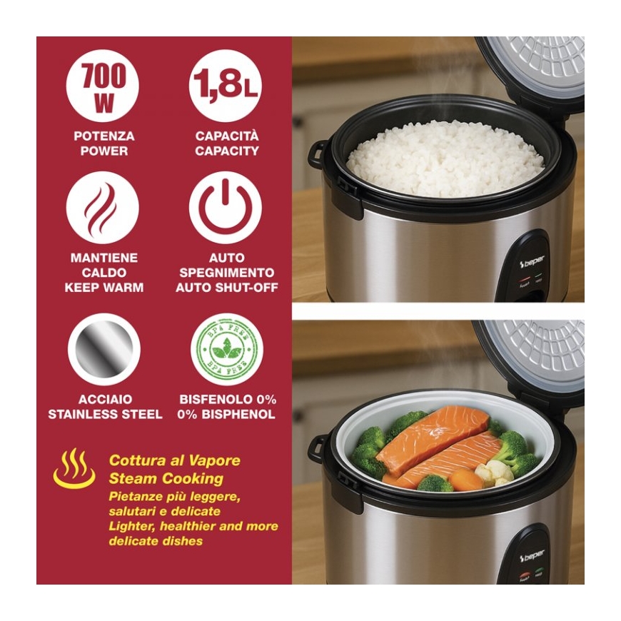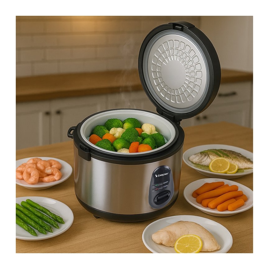 BEPER Vaporé Pro on suure mahutavusega riisikeetja, mis on loodud kuni 1800 g riisi mugavaks, ühtlaseks ja ohutuks valmistamiseks.Jahedate seintega terasraam tagab vastupidavuse ja kaitse, eemaldatav mittenakkuva kattega alumiiniumist mõõteanum aga ühtlase keetmise ja kiire puhastamise.