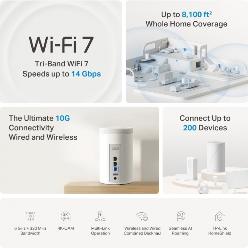 Maksa 5x121.80€TP-Link Deco BE68 tri-band Mesh WiFi 7 -süsteem, mis pakub laiaulatuslikku ja kiiret traadita võrku teie kodu kõikidesse nurkadesse. See seade toetab kuni 14 Gbps ühenduskiirus kolme sagedusalaga (6 GHz, 5 GHz ja 2,4 GHz) ning sellel on mitu h
