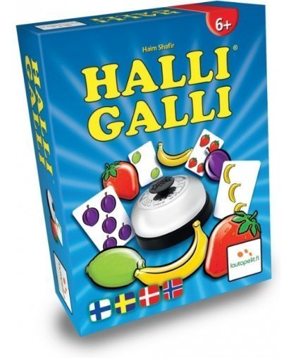 Halli Galli is a wildly fun and fast landing game where you have to have a quick head and hands! Players take turns flipping fruit cards and nimbly wiggling the bell if there are exactly five identical fruits on the table. If the flash reflexes and head-down skills work and the shot is correct, the player collects the cards for himself. Hut, on the other hand, has to pay cards to others. If a player runs out of cards, he is out of the game. The game seems very simple, but not quite as easy as you might imagine. The number of fruits changes in many ways, as the cards are revealed and covered. Attentiveness is rewarded! Watch your fingers! Kling !!!