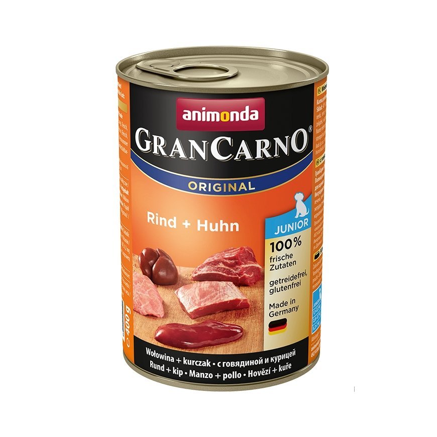 animonda GranCarno Original. Koera eluetapp: Junior, Koeratoidu maitse: Veiseliha, Kana, Maht: 400 g, Pakendi tüüp: Purk, Ilma kunstlike värvaineteta, Suhkruvaba, Sojavaba