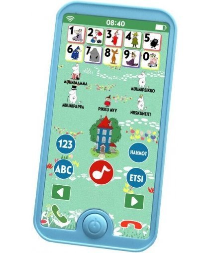 Muumi-älypuhelin tutustuttaa lapsen numeroiden, kirjainten ja Muumien maailmaan hauskalla ja innostavalla tavalla. Puhelinta käytetään kuten oikeaa älypuhelinta ja sillä voi myös ”soittaa” Muumeille ja kuunnella musiikkia!