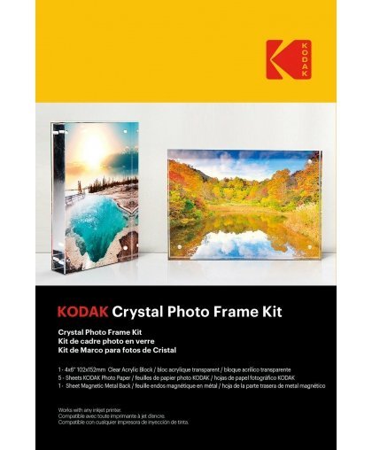 Näytä parhaat valokuvasi tyylillä ja eleganssilla. Minimalistisen muotoilunsa ansiosta Kodak Crystal Photo Frame -valokuvakehys voidaan helposti integroida mihin tahansa sisätilaan ja se on erittäin naarmuuntumaton. Setti sisältää yhden 102x152 mm kirk