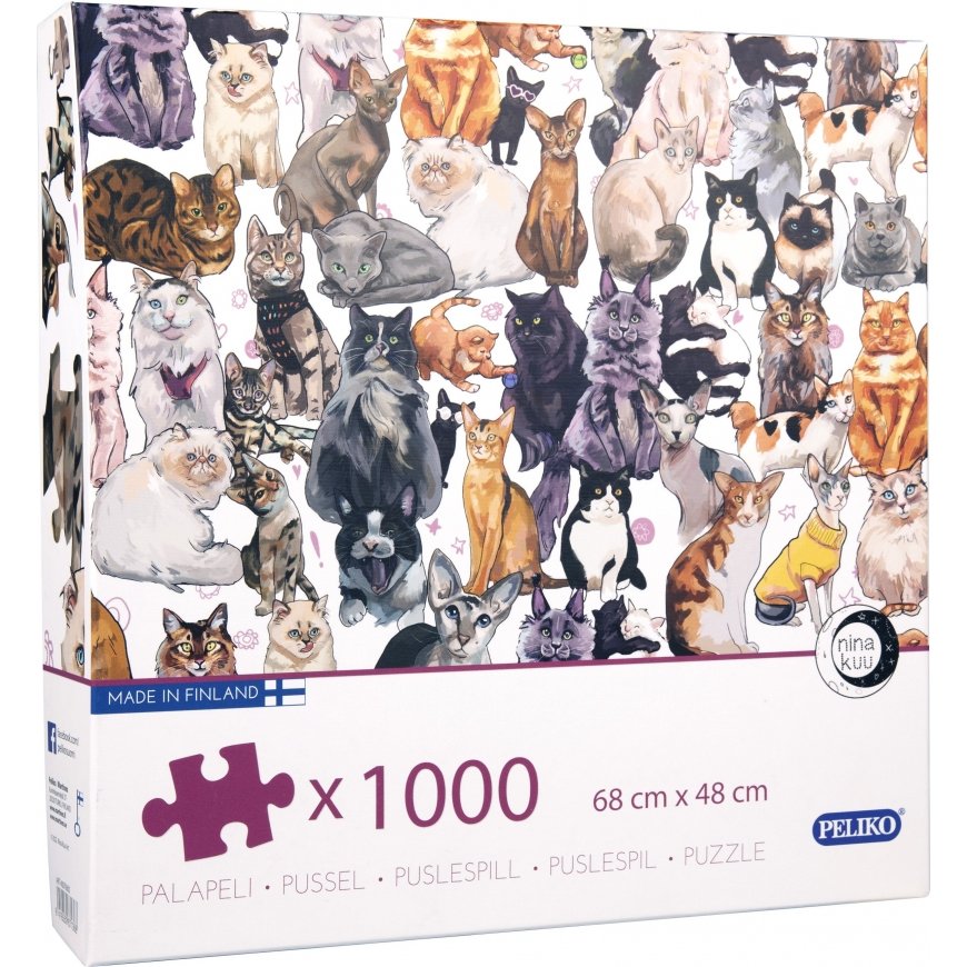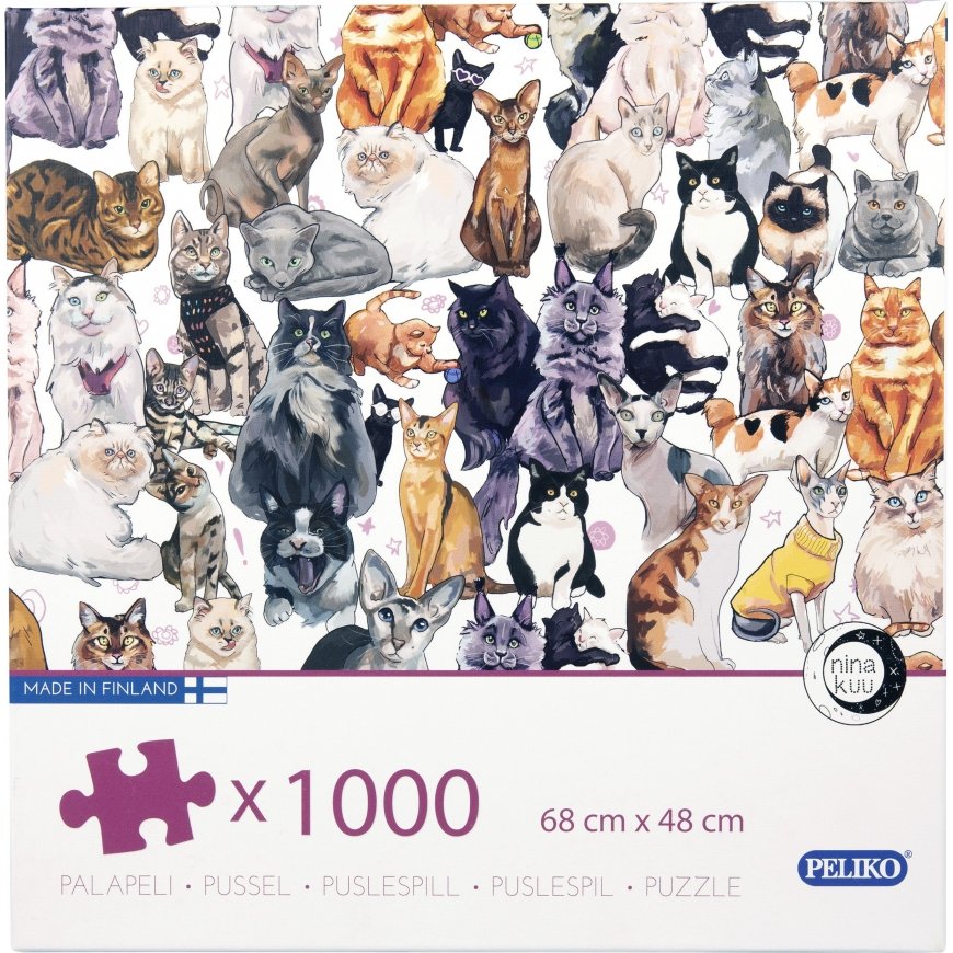 Taiteilija Nina Kuun piirtämä kissoja vilisevä kuva 1000 palan palapelinä. Löydätkö kuvasta oman suosikkikissasi? Valmiin palapelin koko on 68 x 48 cm. Valmistettu Suomessa kierrätyskartongista. Palapelien parissa aivot saavat tarvitsemaansa liikuntaa, ja palapelin kokoaminen on hyvää ajanvietettä leppoisina vapaahetkinä.
