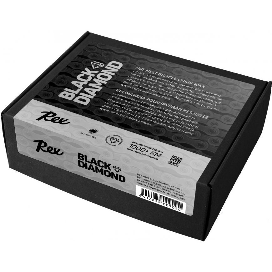Kenties markkinoiden voitelukykyisin kuumavaha, joka on rikkonut testiennätykset arvostetussa Zero Friction Cylingin laboratoriossa! Suositun Black Diamond -ketjuöljyn lisäaineistus siirrettynä kiinteään Rexin vahapohjaan. Black Diamond -ketjuvahassa sulautuu yhteen Rexin yli 70 vuoden kokemus parafiineista, ja markkinoiden voitelukykyisin Black Diamond -lisäaineteknologia. Kuumavaha pitää pyörän koko voimansiirron puhtaana ja hylkii likaa tavallisia ketjuöljyjä huomattavasti paremmin. Riittoisalla 480g pakkauksella käsittelet ketjut kymmeniä kertoja, joten vahaus on myös edullista. Kuumavahaukseen siirtyminen helpottaa pyörän puhtaanapitoa huomattavasti, ja säästää ketjuja sekä rattaita kulumiselta.