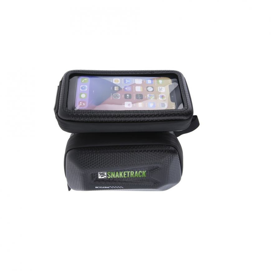 Wodoodporna potrójna torba rowerowa z uchwytem na telefon - Snake Track ST04 czarna Wodoodporna torba rowerowa Snake Track pozwala na wygodne korzystanie z telefonu lub nawigacji w trakcie jazdy na rowerze, także w deszczową pogodę. Wzmocniona konstrukcja „hard-shell” oraz duża pojemność wszystkich toreb (1,5L) pozwalają na bezpieczne przewożenie drobnych rzeczy takich jak klucze, narzędzia, portfel, telefon, rowerowe zapięcie a nawet mały napój, czy kanapki. Montaż torby jest łatwy i szybki - nie są do tego potrzebne żadne narzędzia. Dzięki przewodzącej dotyk folii możemy obsługiwać ekran dotykowy bez wyjmowania telefonu z torby. Produkt montujemy na ramie roweru, zapewniając bezpieczeństwo przewożonemu telefonowi. Rozmiar miejsca na telefon 18 x 8cm, okno 16,2 x 6,6cm. Ochrona przed wodą Skorupa „hard-shell” oraz gumowy zamek o podwyższonej wodoodporności zabezpiecza zawartość przed wilgocią oraz chroni telefon oraz zawartość schowka przed deszczem. Aktywny dotyk Powłoka okna na ekran telefonu wykonana z TPU pozwala na użytkowanie telefonu bez wyciągania go z torby. Pojemny i wygodny schowek Każda z trzech toreb ma dwie wewnętrzne przegródki, które pozwalają oddzielić zawartość głównej kieszeni od mniejszych elementów jak portfel, czy słuchawki, karty, klucze, itp. Odpinany pokrowiec na telefon Torba/pokrowiec na telefon montowana na duży, silny rzep zapewnia bezpieczeństwo podczas ruchu i możliwość łatwego odpięcia i zabrania telefonu ze sobą podczas parkowania. Otwór słuchawkowy Pozwala na bezpieczne korzystanie ze słuchawek przewodowych, bądź ładowarki podczas jazdy bez uszczerbku dla wodoodporności.