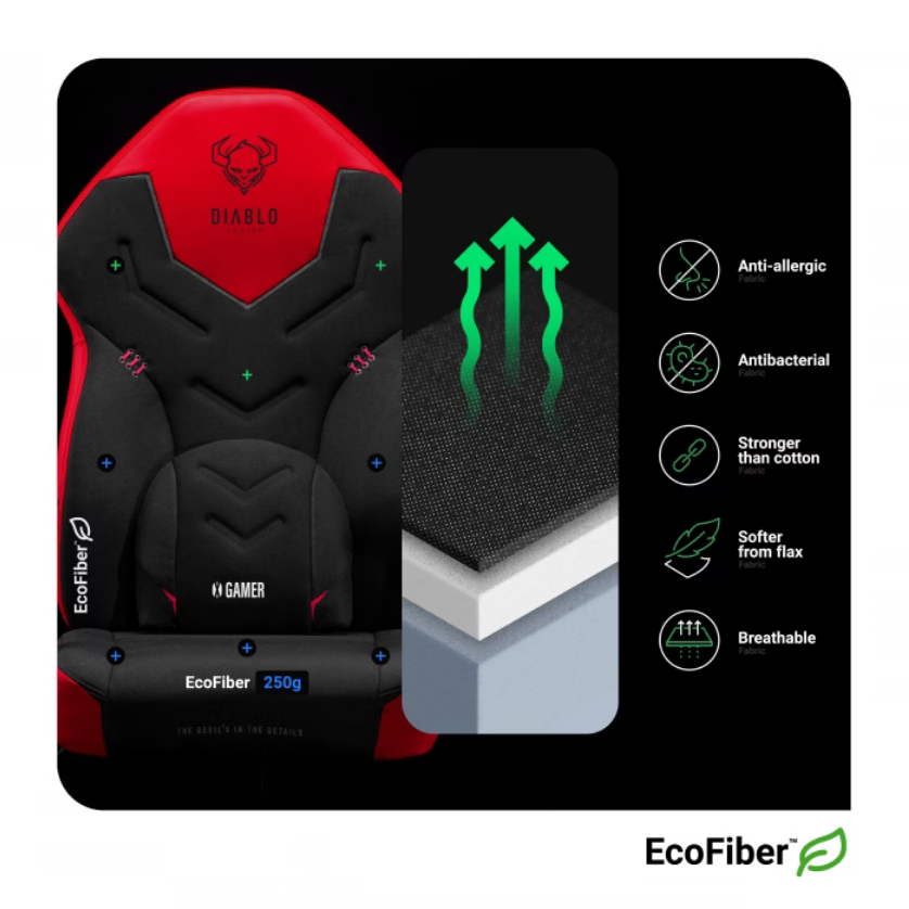 Diablo X-Gamer -malli on lähes kokonaan peitetty kankaalla! EcoFiber™ on erittäin kulutusta kestävä materiaali, joka varmistaa erinomaisen ilmankierron ja suojan ylikuumenemiselta jopa kuumimpina päivinä. Tämä viimeistely tekee jokaisesta pelaamisesta entistä mukavampaa.