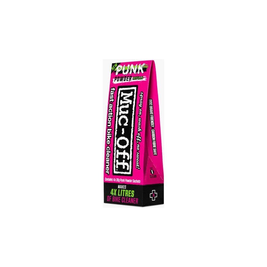 Muc-Off Punk Powder on tehokas ja ympäristöystävällinen puhdistusainejauhe polkupyörille ja pyörän osille. Sekoita vain 30 gramman jauhepussi litraan vettä ja saat valmista puhdistusainetta. Jauhe sekoittuu hyvin kylmään tai kuumaan veteen. Pakkaus sis