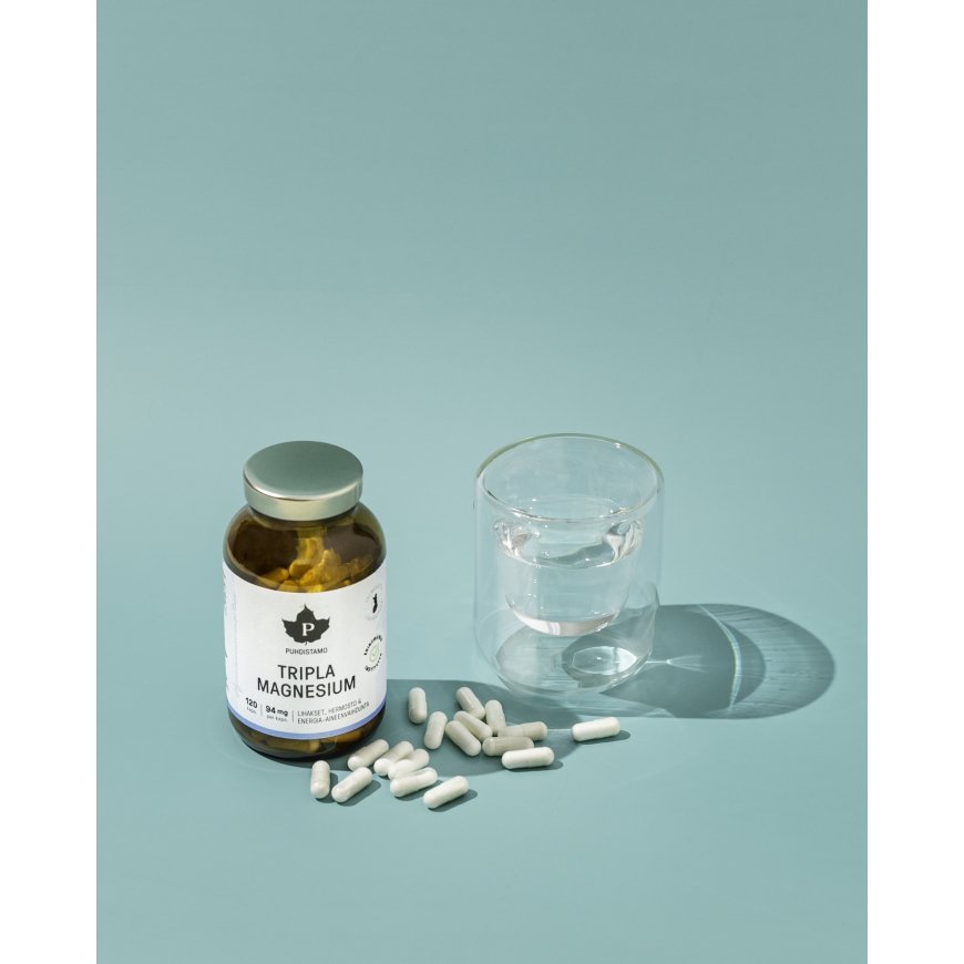 Puhdistamon Tripla Magnesium sisältää kolmea korkealaatuista magnesiumin muotoa: magnesiummalaattia, -glysinaattia ja -tauraattia tasapainoisena yhdistelmänä. Magnesium edistää muun muassa lihasten toimintaa, proteiinisynteesiä, energia-aineenvaihdunta