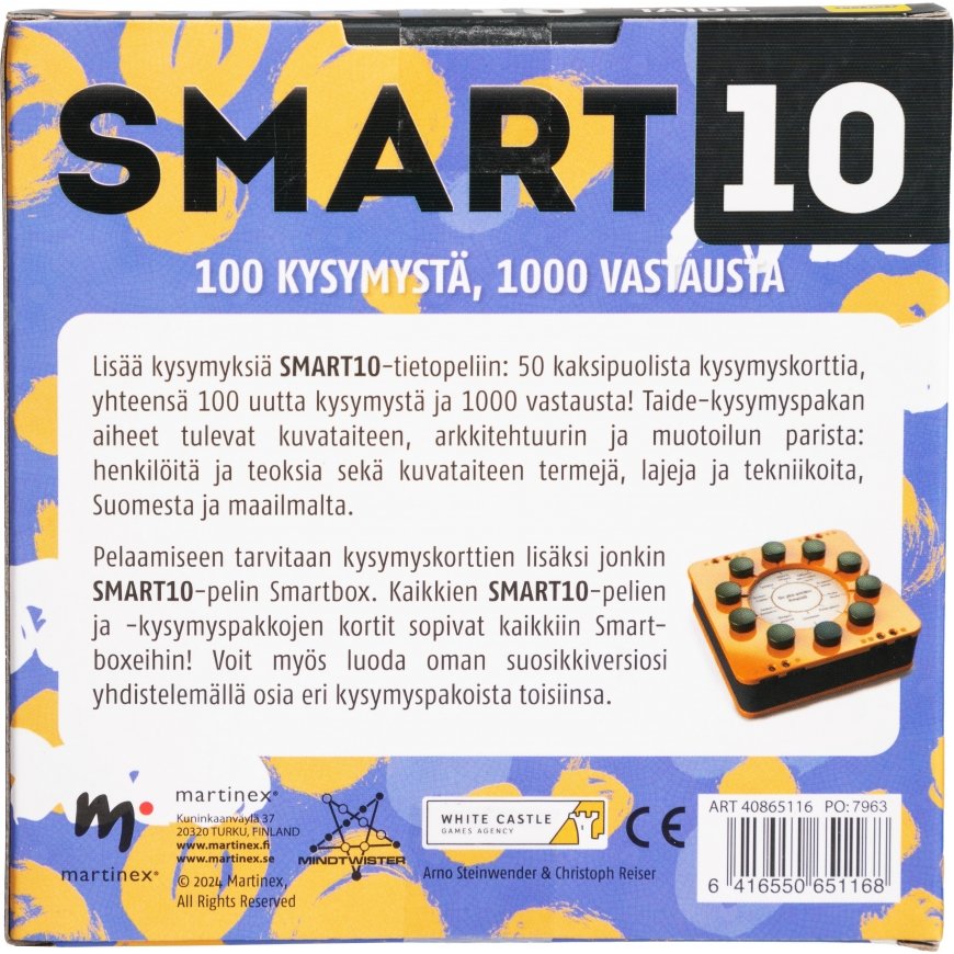 Lisää kysymyksiä SMART10-tietopeliin: 50 kaksipuolista kysymyskorttia, yhteensä 100 uutta kysymystä ja 1000 vastausta! Kysymyspakan aiheet tulevat kuvataiteen, arkkitehtuurin ja muotoilun parista, ja koskevat tunnettuja henkilöitä ja teoksia sekä kuvat