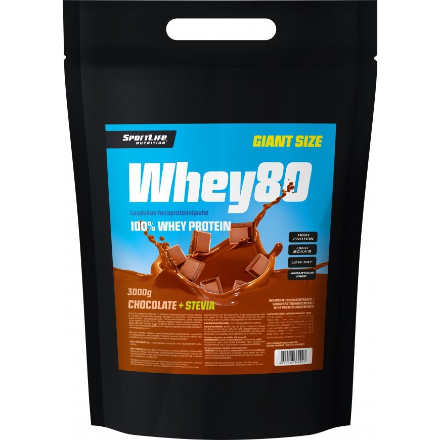 Maksut 5x17.80€SportLife Whey80 on edullinen ja laadukas suklaanmakuinen heraproteiinijauhe kaikille urheilua ja kuntoilua harrastaville. Stevialla makeutettu sokeriton Whey80 on valmisettu ensiluokkaisista raaka-aineista korkeatasoisilla valmistusmenetelmill