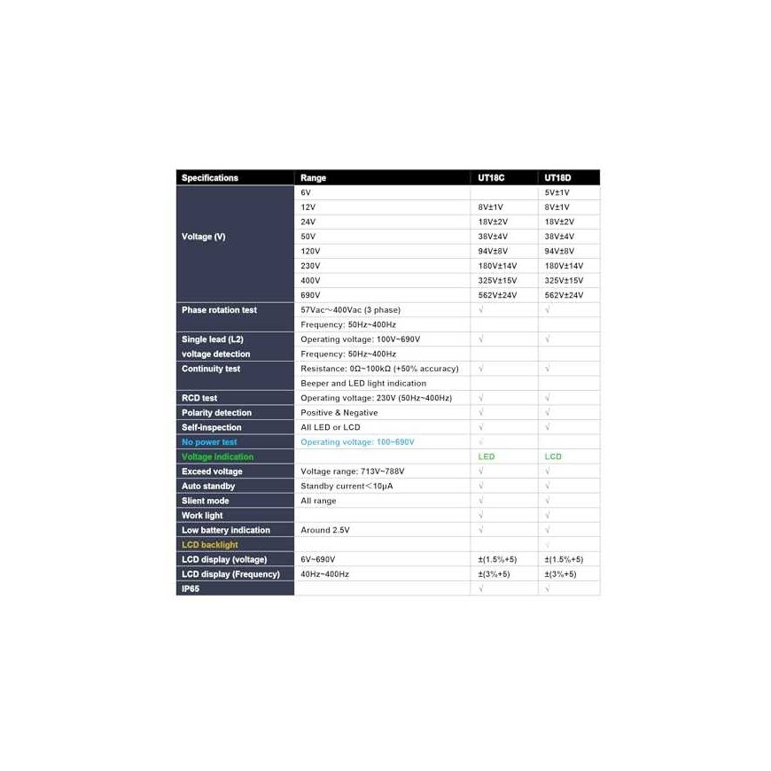 Maksut 5x14.41€AC/DC jännite 6/12/24/50/120/230/400/690 V; Vaihejärjestys 100-690 V; Taajuus 50-400 Hz; Sähköposti piirin testaus 0-100 kΩ; RCD 230 V (50-400 Hz); IP65; Valaistus, Automaattinen alueen valinta; napaisuuden määritys; jne.; LCD-näyttö 73,5x35,5 mm; 2 x 1,5 V paristot (AAA).