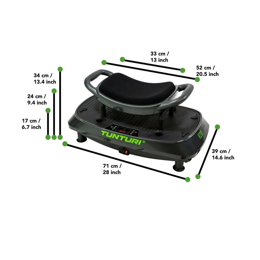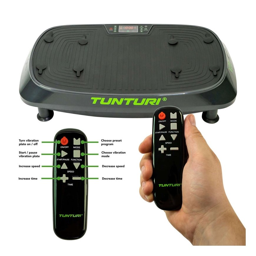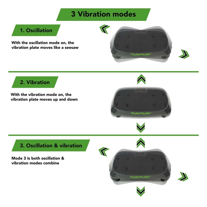 Tunturi Cardio Fit V10 käyttää värähtelyä, tärinää ja näiden kahden yhdistelmää. Värähtely tarkoittaa, että levy liikkuu nopeasti ylös ja alas. Värähtelyt ovat keinuvaa liikettä. Molemmat varmistavat, että keho menee epätasapainoon ja siksi lihakset alkavat työskennellä tasapainon säilyttämiseksi. Tämä mahdollistaa eri lihasryhmien harjoittelun ilman monimutkaisia harjoituksia. Värähtelyjen ja värähtelyjen yhdistelmä luo kolmiulotteisen harjoittelun maksimaalista haastetta varten.