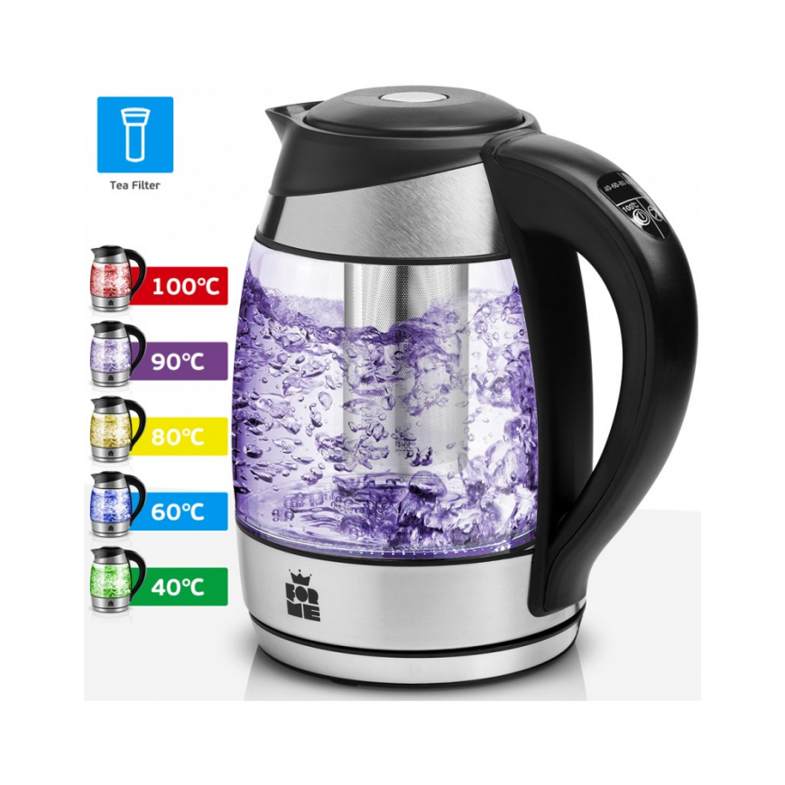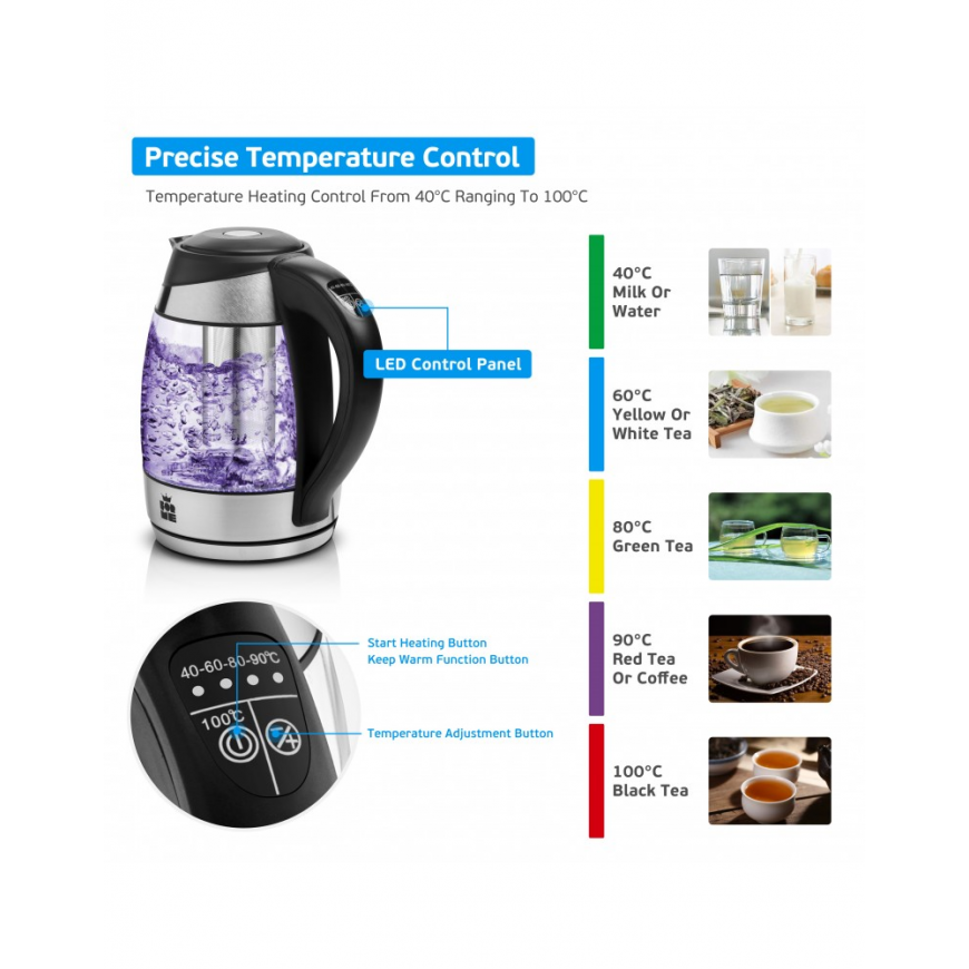 Vain napin painalluksella tässä tyylikkäässä, helppokäyttöisessä, useita lämpötiloja kestävässä lasisessa vedenkeittimessä voit nauttia erilaisista ruoanlaittovaihtoehdoista. Valitse 40°C, 60°C, 80°C, 90°C ja 100°C lämpötilat kahville tai teelle. Jokainen lämpötila ilmaistaan erivärisellä LED-valolla. Et voi vain lämmittää vettä vaadittuun lämpötilaan, vaan myös pitää sen samassa lämpötilassa kaksi tuntia. Tässä mallissa on teesuodatin, eikä siinä ole äänimerkkejä.