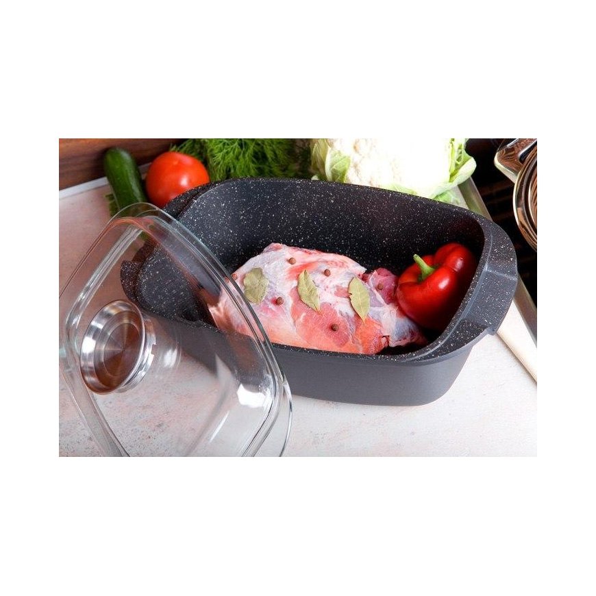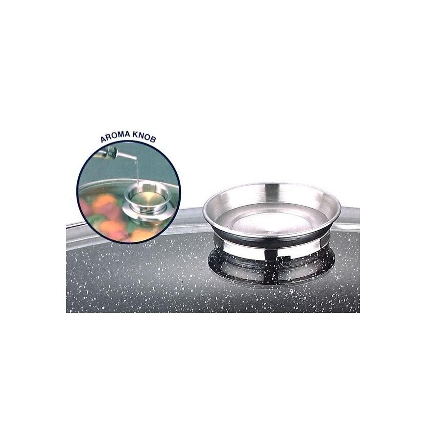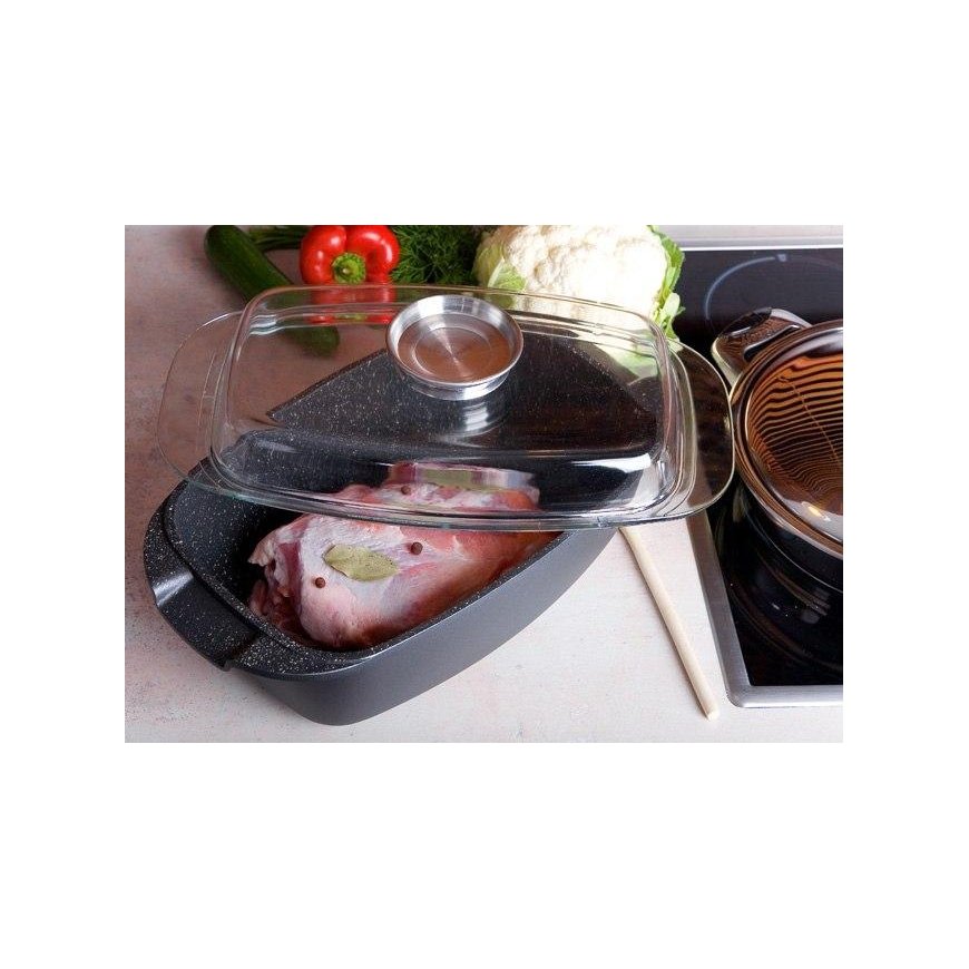 2-osainen marmorinen uunivuoka 33cm (5,5L) valetusta alumiinista KINGHOFF . Uuden sukupolven marmoripinnoite on valinta jokaiselle, joka haluaa helposti valmistaa terveellisiä ja herkullisia ruokia, unohtaa ruuan tarttumisen kattilan tai pannulle ja tarjoilla ruokia luonnollisen makuisina ja täysin mehusina. Voidaan käyttää sekä liedellä että uunissa (metallikahvat ilman muoviosia). Sopii kaikentyyppisille liesille, paitsi induktiolle. Innovatiivisen Aroma Knobin ansiosta öljyä tai oliiviöljyä, mm. maustettu, voidaan automaattisesti annostella uunipellille. Tämä pitää ruoan mehukkaana ja estää sitä palamasta.