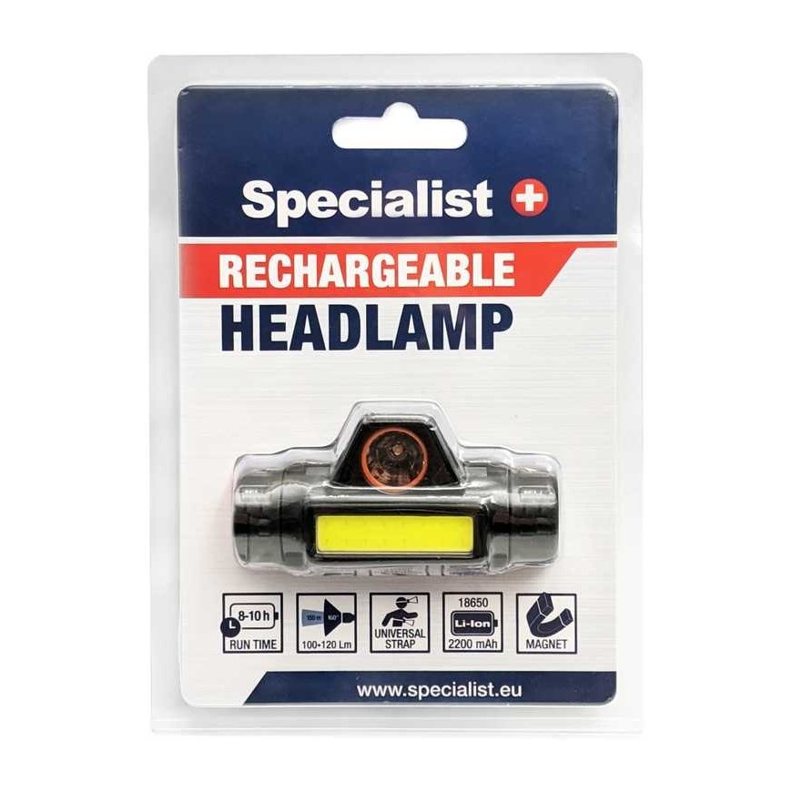 Specialist+-kohdevalo on asennettu päähän. Ominaisuudet ja tekniset tiedot: • Säädettävä teho, ladattava 2200 mAh akku. • Sisäänrakennetun magneetin avulla voit kiinnittää kohdevalon metallipintoihin. • Voidaan käyttää myös kädessä pidettävänä kohdevalonheittimenä. • Täyteen ladatun kohdevalonheittimen toiminta-aika on 8–10 tuntia. • Kohdevalonheittimen latausaika on 5–6 tuntia.