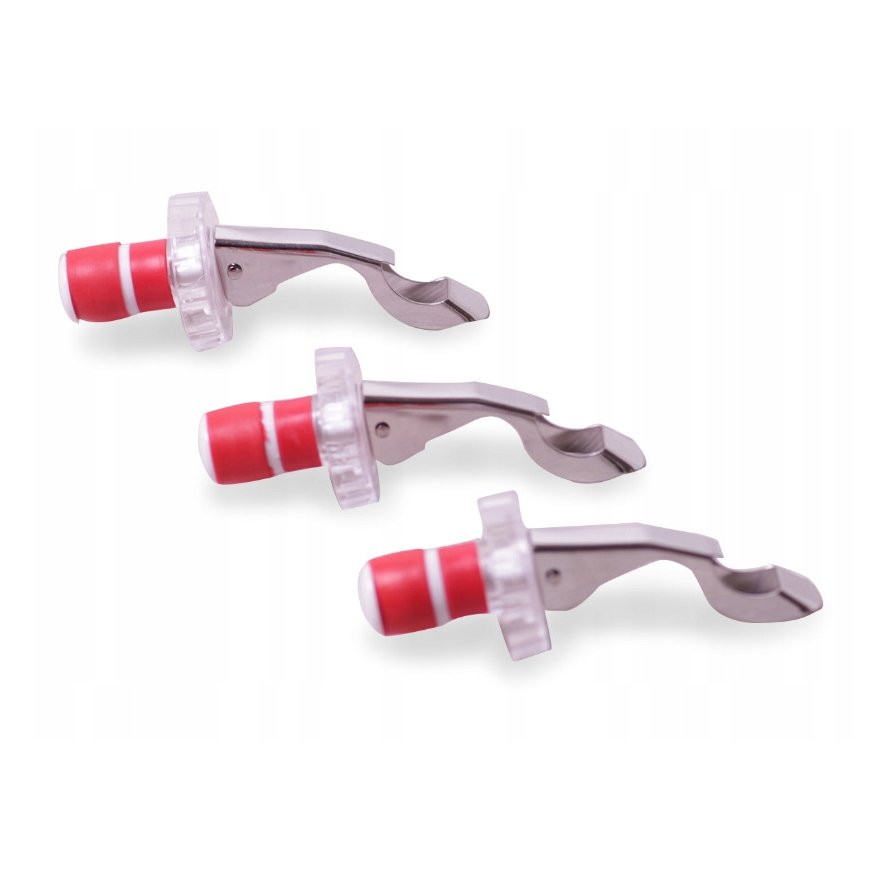 Pulloitinsulkijat + avain (3 kpl), 7782, KAMILLE. Materiaali: ruostumaton teräs, muovi. Soveltuu tiivisti pullojen kaulaan, mikä takaa ilmatiiviin sulun. Mahdollistaa metallikorkkien helpon avaamisen. Ominaisuudet: standardikoko, joka sopii useimpiin pulloihin.