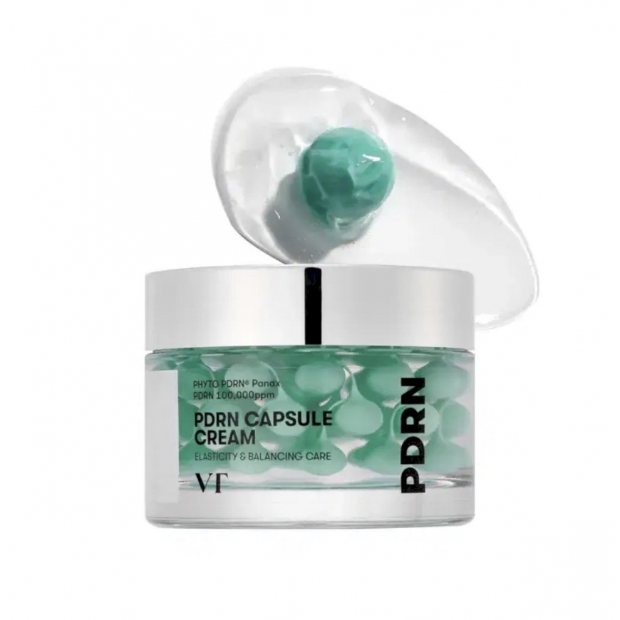 VT Cosmetics PDRN Capsule Cream 100 50ml is a regenerating capsule cream formulated with 100000ppm PHYTO PDRN® derived from ginseng to improve elasticity, enhance skin texture and deliver deep hydration, enriched with ceramides, nine peptides, squalane and ten types of hyaluronic acid to strengthen the skin barrier and support firmness, the visible capsules melt into the gel-cream texture upon application providing nourishment and radiance without heaviness, and with regular use skin appears smoother, firmer and more revitalized.