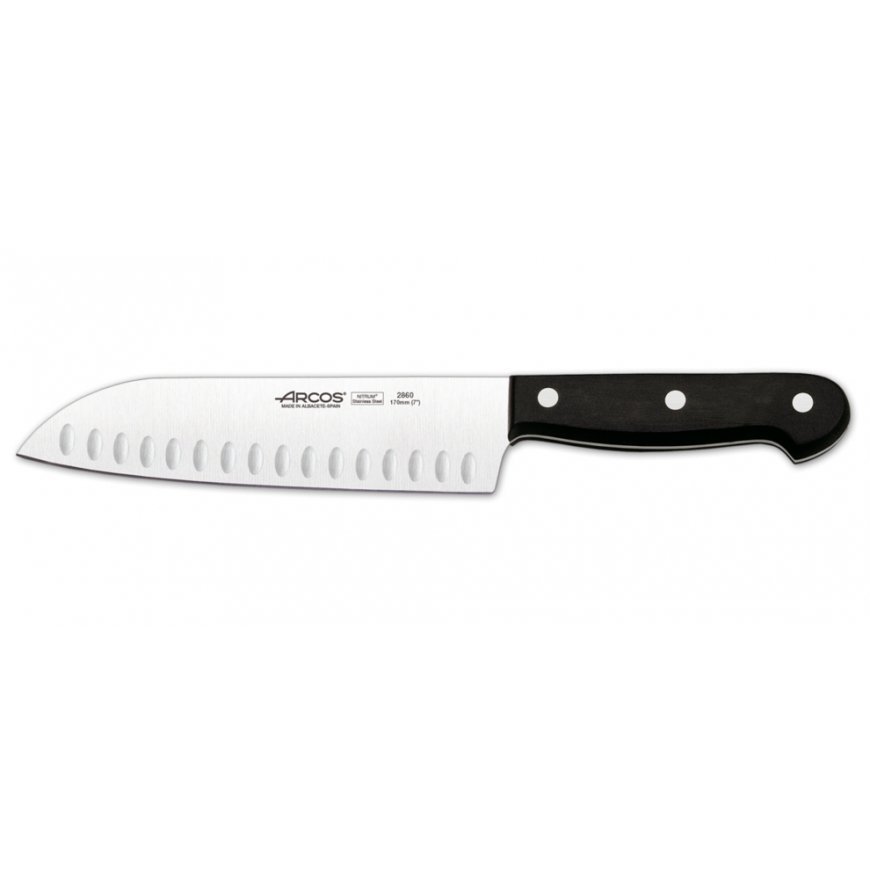 17 cm terällä varustettu laadukas santoku joka sopii moniin keittiötöihin. Santokuveitsen molemminpuolinen ovaalihionta vähentää tarttumista viipaloidessa. Valmistettu hyvin teroittuvasta Nitrum -ruostumattomasta teräksestä jonka kovuus on Rockwellin asteikolla C56. Terän teroituskulma on 20 astetta, joten ARCOS- veitset ovat kestäviä ja helppohoitoisia työkaluja päivittäiseen käyttöön. Veitsissä käytetyt tukevat polyoxymethylene -muovikahvat kestävät hyvin kosteutta ja tarjoavat pitävän otteen.