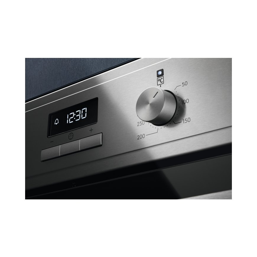 Electrolux EOF3H70X. Uunin koko: Keskikokoinen, Uunin tyyppi: Sähköuuni, Sisäinen kapasiteetti yhteensä: 72 L. Laitteen sijoitus: Kiinteä, Tuotteen väri: musta, Ruostumaton teräs, Ohjaustyyppi: Painikkeet, Rotaatio. Ajastintyyppi: Digitaalinen. Energiankulutus (tavanomainen): 0,93 kWh, Energiankulutus (pakotettu konvektio): 0,81 kWh, Energiatehokkuusasteikko: A+++:sta D:hen. Lamppujen määrä: 1 lamppua, Lampputyyppi: Halogeeni, Lampun teho: 40 W