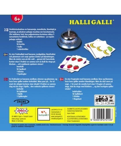 Halli Galli on hurjan hauska ja nopea laskupeli, jossa pitää olla nopea pää ja kädet! Pelaajat kääntävät vuorotellen hedelmäkortteja ja kilauttavat vikkelästi soittokelloa, jos pöydällä on tasan viisi samanlaista hedelmää. Jos salamarefleksit ja päässälaskutaito toimivat ja lyönti on oikein, pelaaja kerää kortit itselleen. Hutilyönnillä taas joutuu maksamaan kortteja muille. Jos pelaajan kortit loppuvat, hän on ulkona pelistä. Peli vaikuttaa erittäin yksinkertaiselta, mutta ei ole aivan niin helppo kuin voisi kuvitella. Hedelmien määrä muuttuu monin tavoin, korttien paljastuessa ja peittyessä. Tarkkaavaisuus palkitaan! Varokaa sormianne! Kling!!!