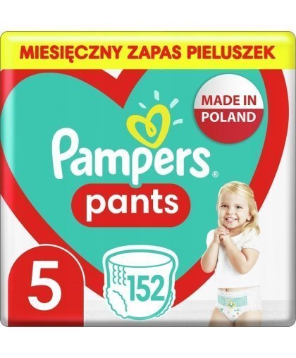 Maksut 5x13.82€Pampers Pants Pull‑Up Diapers Size 5 (12‑17 kg) 152pcs are premium disposable pull‑up diapers designed for active toddlers weighing approximately 12 to 17 kg, offering up to 12 hours of reliable leak protection with an innovative Stop & Protect Pocket system, a 360° elastic waistband, a super‑absorbent core and double cuffs around legs; this structure quickly wicks moisture away from the skin to keep it dry and comfortable for a long time, while the diapers are easy to pull on and off even with an active child, do not pinch or irritate the skin, and breathable materials plus dermatological approval make them safe for everyday use at home, on walks, or while travelling.