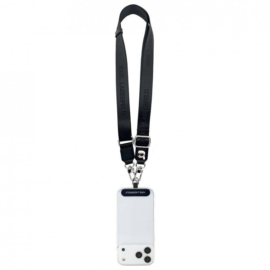 Thanks to the iconic design with the repeated Karl Lagerfeld logo and the Karl Lagerfeld motif above the carabiners, the strap is not only functional, but also distinctly fashionable.