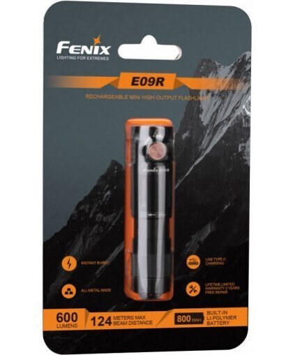 Fenix E09R yra kišeninis EDC žibintuvėlis raktų pakabuko pavidalu, skleidžiantis šviesą 600 liumenų srautu, turintis 5 naudingus apšvietimo režimus, diapazoną iki 124 m ir įmontuotą bateriją, įkraunamą per USB- C prievadas.Plunksninis svorisŽibintuvėlio Fenix E09R korpusas pagamintas iš aliuminio, kuriam buvo atliktas HA-III kietojo anodavimo procesas, kurio dėka žibintuvėlio vamzdis ir galvutė yra atsparūs mechaniniams pažeidimams, įbrėžimams ir trinčiai. Kompaktiškas žibintuvėlis (79 mm) leidžia patogiai nešiotis žibintuvėlį kišenėje arba pritvirtinti kaip raktų pakabuką. Riektuotas aliuminio paviršius pagerina sukibimą ir neleidžia žibintuvėliui išslysti iš rankos.Stipriau ir toliauŠviesos šaltinis yra efektyvus SST20 LED diodas, kuris pliūpsnio režimu skleidžia 600 liumenų srautą, kurio ryškumas yra 3970 kandelų, o diapazonas yra iki 124 m. Šviesa tolygiai ir plačiai pasklinda naudojant ultra- plonas kolimuojantis lęšis.Spindulio padalijimas:taškas 13° (sufokusuotas),išsiliejimas 81° (difuzinis).Veikimo režimaiNaudotojas turi 5 šviesos režimus: mėnulio šviesą, žemą, vidutinį, aukštą ir 600 liumenų srautą. Esant dideliam 300 liumenų režimui, žibintuvėlis gali veikti iki 90 minučių, 3 liumenų „mėnulio“ režimu – iki 70 valandų. Naudingiausi kasdieninio naudojimo režimai apima serijos režimą (visa 600 liumenų galia), skirtą trumpam, bet intensyviam apšvietimui, ir mėnulio šviesos režimą. Subtilaus 3 liumenų švytėjimo pakanka skaitymui, rankinės, įrankių dėžės prožektoriui ar durų spynos atidarymui.Žibintuvėlyje naudojama intelektuali atminties funkcija, kuri automatiškai parenka paskutinį naudotą režimą prieš jį išjungiant, kai žibintuvėlis vėl įjungiamas.Integruota baterijaŽibintuvėlis maitinamas 800 mAh talpos ličio polimero baterija, kuri įkraunama per paslėptą USB-C prievadą. Prie įkrovimo lizdo pasiekiame tik išslydę žibintuvėlio korpusą, ko dėka prievadas yra tinkamai apsaugotas nuo purvo ir drėgmės. Skirtingai nuo kitų žibintuvėlių su USB prievadu, Fenix E09R gali švytėti net kraunant.Metalinis jungiklis su užrakto funkcijaŽibintuvėlis įjungiamas ir režimai keičiami naudojant metalinį jungiklį, esantį ant šoninės sienelės. Žibintuvėlio palaikymas:Visiškai paspaudus mygtuką, žibintuvėlis įjungiamas ir išjungiamas,vienu prisilietimu galima keisti režimus,dukart spustelėjus įjungiamas užraktas, neleidžiantis netyčia įsijungti žibintuvėlį nešiojant.Dėl minimalistinės sąsajos žibintuvėlis puikiai tinka kasdienėms programoms, kur mums paprastai tereikia greitos prieigos prie šviesos.SaugumasŽibintuvėlyje naudojama sistema, apsauganti elektroninę sistemą nuo perkaitimo. Didelio režimo šviesos diodas sukuria daug šilumos, kad sumažintų temperatūrą, valdiklis automatiškai sumažins srautą keliais liumenais. Aukšta apsaugos klasė IP68 užtikrina, kad žibintuvėlis būtų atsparus visiškam panardinimui į vandenį (iki 2 m gylio), dulkėms ir purvui bei kritimui.Pateikti parametrai gauti laboratorinėmis sąlygomis. Bandymų metu buvo naudojama Li-Po 800 mAh baterija.Režimasšviesos srautas [lm]darbo laikas [h min.]diapazonas [m]šviesos intensyvumas [cd]sprogo600-1243970ūgio3001 valanda 50 minučių912084 mvidutiniškas1004 valandos56777trumpas2516 valandų28192mėnulio šviesa370 valandų920