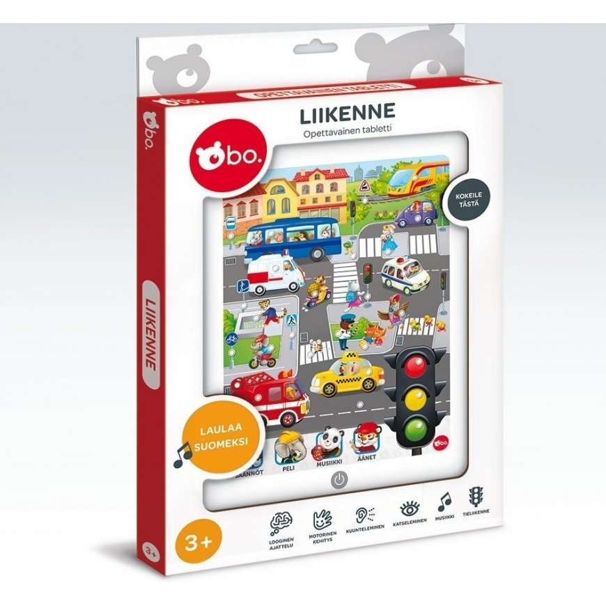 Rekomenduojamas amžius: 3+ 1 planšetėTaip lengva ir smagu išmokti kelių eismo taisykles su nauja, suomiškai kalbančia bo. Eismo mokomoji planšetė! Klausykite kelio ženklų ir kelio ženklinimo pavadinimų, transporto priemonių pavadinimų ir jų garsų. Prisiminkite taisykles ir patikrinkite savo žinias žaisdami patrauklų žaidimą! Linksmos melodijos papildys linksmybes! Apima tokias populiarias vaikų dainas kaip Autolaulu ir Bussilaulu. ATSARGIAI: Netinka vaikams iki 3 metų dėl smulkių dalių. Užspringti! Naudoti kartu su suaugusiuoju. Spalvos ir turinys gali skirtis nuo pavaizduotų. Niekada nežaiskite su gaminiu šalia didelio karščio, įskaitant ugnį. Prieš duodami šį gaminį vaikui, nuimkite pakuotę ir priedus. Išsaugokite pakuotę ateityje. Reikalingos 3 x AAA 1,5 V baterijos, įtrauktos į „Try-me“ demonstravimą. Rekomenduojamos šarminės baterijos. Neįkraunamos baterijos nėra įkraunamos. Negalima maišyti skirtingų tipų baterijų arba naujų ir naudotų baterijų. Galima naudoti tik to paties arba lygiaverčio tipo baterijas, kaip rekomenduojama. Baterijos turi būti įdėtos teisingu poliškumu. Išsikrovusias baterijas reikia išimti iš gaminio. Maitinimo gnybtai neturi būti trumpai jungiami. Nemeskite baterijų į ugnį.
