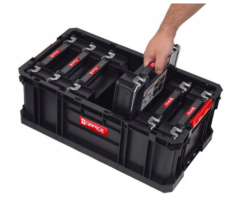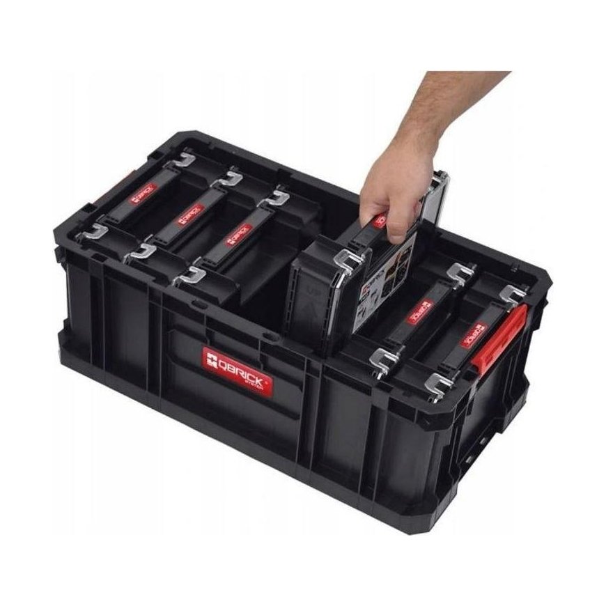 Dėžutė su 6 organizatoriais MULTI Qbrick System TWO BOX 200 - tai modulinė dėžė, kurios talpa padidinta ir kuri yra puikus sprendimas ne tik elektriniams įrankiams, rankiniams įrankiams ir statybinėms medžiagoms gabenti, bet ir įvairiems daiktams laikyti, pavyzdžiui, garaže ar namuose.